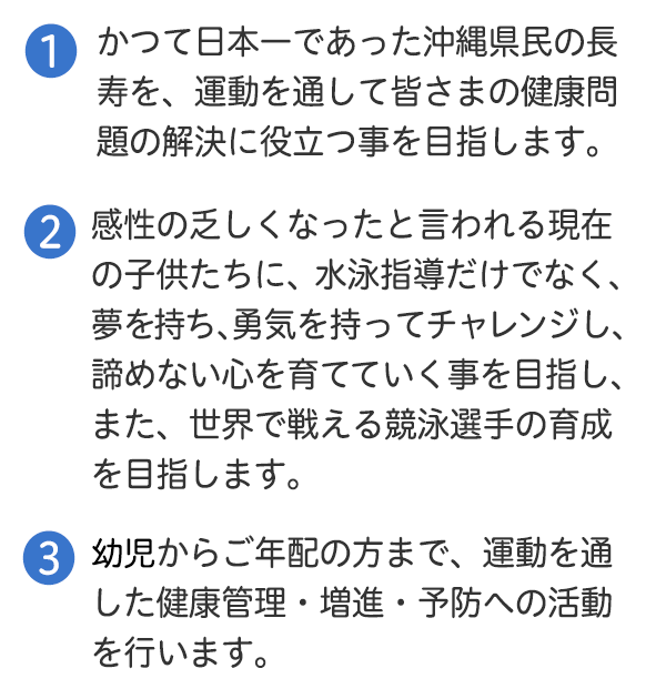 通常、多くのスポーツ施設では、運動機会の提供のため、より多くの設備を整え、器具などのハードに依存する傾向にあり、スポーツ指導においては、安易な目標設定に頼り、やる気や達成感などの精神的な醸成が疎かになる場合があります。当施設では、長い経験に基づいた「心・技・体」のバランスの取れた指導と支援を核とした運営を行っていきます。